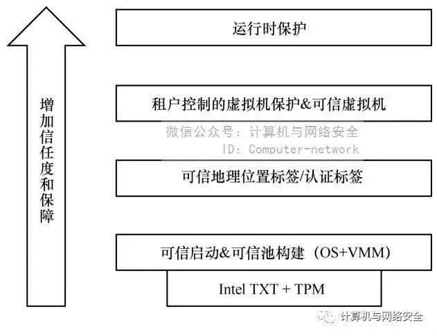 (1)可信启动:确保计算资源硬件、固件、宿主机(VMM)等的安全可信,实现可信计算资源池的构建。
