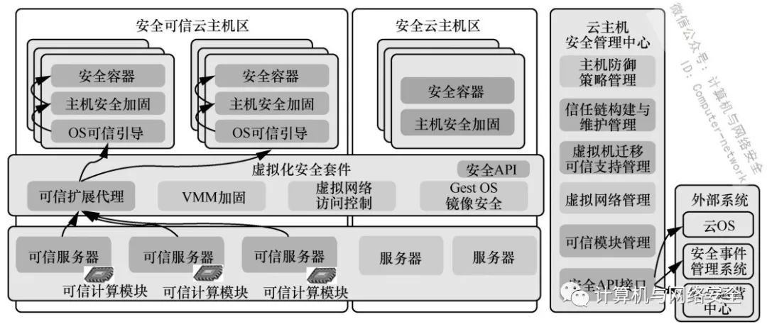 可信云主机方案主要由可信服务器、虚拟机安全套件、主机安全加固软件、应用安全容器套件等部分组成。