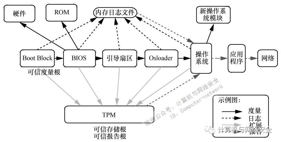 1、所有模块或组件,除了CRTM(信任链构建起点,第一段运行的用于可信度量的代码),在没有经过度量以前,均认为是不可信的。同时,只有通过可信度量且与预期数据相符的模块或组件,才可归入可信边界内。