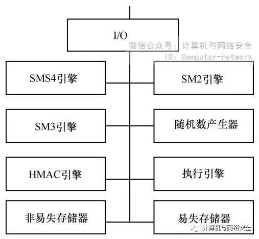 2006年,在国家密码管理局的主持下,我国制定了《可信计算平台密码技术方案》和《可信计算密码支撑平台功能与接口规范》2个规范。国内可信计算平台密码方案本质上和TCG的可信计算平台方案是一致的。国内可信计算平台密码方案采用的信任根是可信密码模块(TCM),该模块是我国可信计算从业人员参考TCG TPM1.2改进创新实现。TCM采用国内的密码算法作为密码学服务单元。其基本结构如图3所示。
