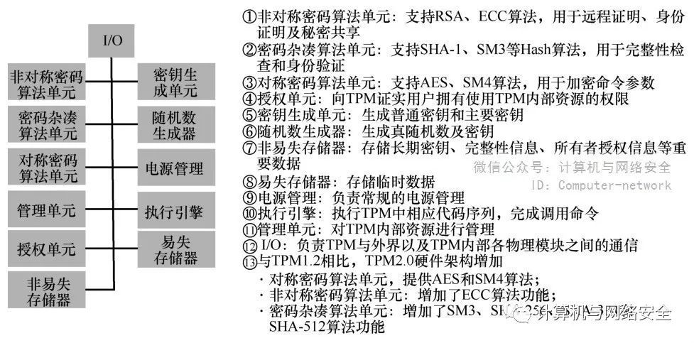 可信平台模块是可信计算平台的信任根(RTS、RTR),它本身是一个SOC芯片,由CPU、存储器、I/O、密码协处理器、随机数产生器和嵌入式操作系统等部件组成,主要用于可信度量的存储、可信度量的报告、密钥产生、加密和签名、数据安全存储等功能。