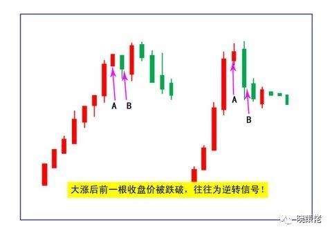 9)股价大涨后,前一根K线收盘价被跌破怎么看?