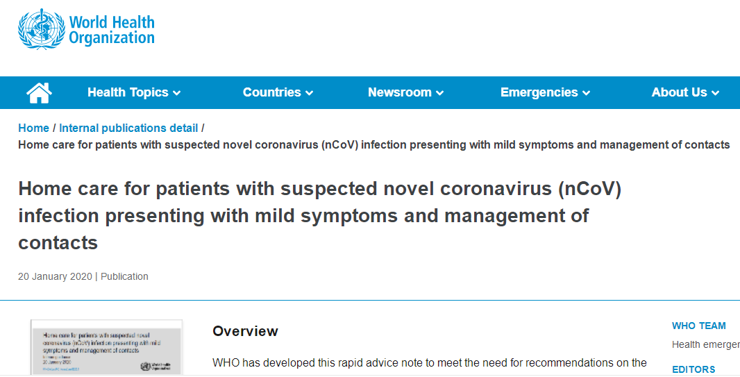 1月20日,世界卫生组织(WHO)发布了一份紧急指南,目标读者是公共卫生及感染防控(IPC)专家、医护管理层、一线医护人员。该紧急指南参照2018年6月1日发表的中东呼吸综合征(MERS-CoV)指南基础上进行修改,对当前疑似新型冠状病毒(2019-nCoV)感染且症状表现轻微者提出“家中隔离”相关建议,以及指导对(疑似)病例密切接触者所进行的公共卫生防控措施。