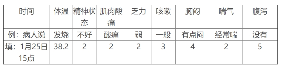 除了体温,其他的填数字1~5,1是感觉受不了,非常难受或者非常差,5是完全好转。如果都是5,那就好了,如果和之前比很多数字变小了,或是某一项到1了,就要赶紧联系医生了。