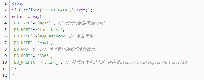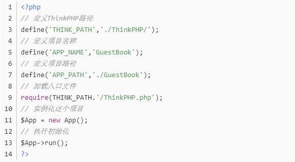 1. 在根目录下建立一个项目文件夹,如 GuestBook_Think,把ThinkPHP复制到里面,同时建立存放本项目的文件夹GuestBook,再新建一个PHP文件index.php,定义入口,代码如下: