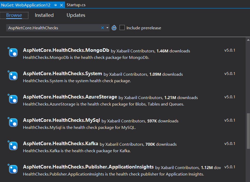 除了web的活性检查,还可以检查诸如:SQL Server, MySQL, MongoDB, Redis, RabbitMQ, Elasticsearch, Hangfire, Kafka, Oracle, Azure Storage 等一系列服务应用的活性,每一个服务需要引用相关的 nuget 包即可,如下图所示: