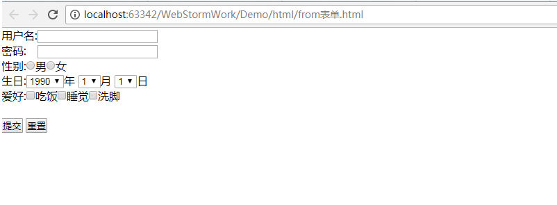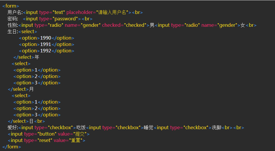 <input type="reset" value="重置">重置按钮,清空输入的内容,但是要放在<from>表单标签里面才生效