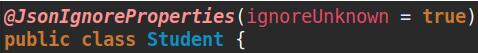 由此可见,在默认情况下,jackson是不支持json串的字段多于实体类字段的,但是,jackson也提供了解决方案,我们在实体类上,添加注解@JsonIgnoreProperties,这个注解有一个ignoreUnknown属性,默认值为false,我们可以将它改为true,这样jackson在反序列化的时候,就会忽略掉不存在的属性了。(@JsonIgnoreProperties(ignoreUnknown = true))