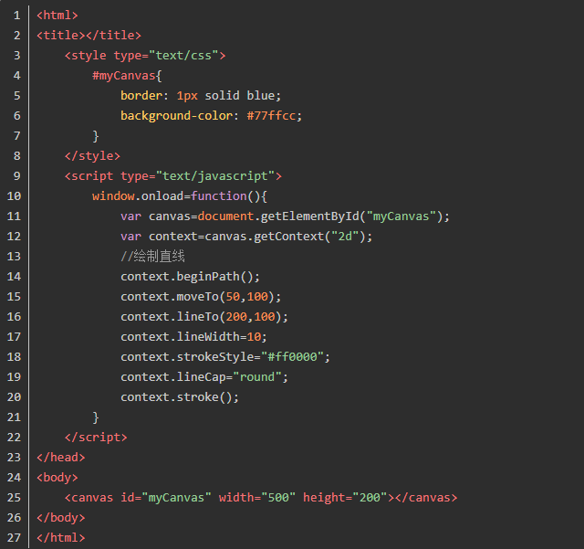 在html5页面中添加canvas元素,定义id属性值以便后面调用: