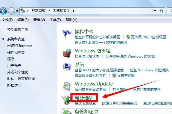 4、在系统和安全页面里找到电源选项,点击进入。