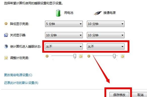 6、在使计算机进入睡眠状态选项里面勾选从不,然后点击保存,这样就可以将自动锁屏关闭。