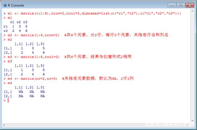 m4 <- matrix(nr=2,nc=3) #未指定元素数据,默认为NA,2行3列,nr是nrow的简写,nc是ncol的简写,R能识别