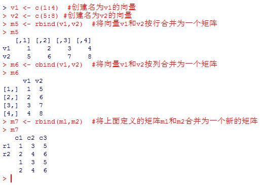 m7 <- rbind(m1,m2) #将上面定义的矩阵m1和m2合并为一个新的矩阵
