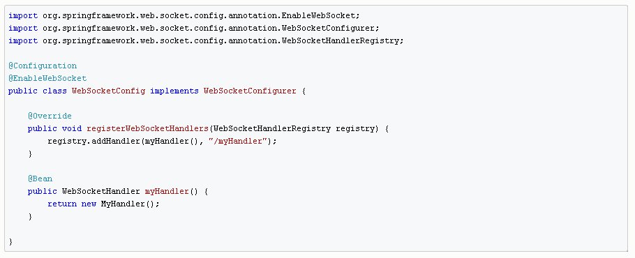 配置有两种方式:注解和 xml 。其作用就是将 WebSocket 处理器添加到注册中心。