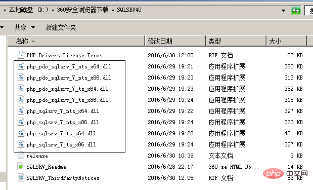 下载下来的 SQLSRV40.exe 右键解压得出下面的dll文件,这些是php的扩展