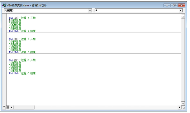 上图模块中就是三个SUB过程,分别为 A、B、C,这些名称是可定义的,除了系统保留字不可用,其它都行,什么是系统保留字呢,比如,SUB 就是系统保留字,不可用作名称,还有 Dim 、END等等,不知道的没关系,如果不能用的系统会报错。