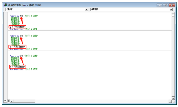 Function 函数过程与 SUB 过程,执行原理是一样的,不同的是,Function 函数是有返回值的,而 SUB 过程却没有返回值,下图中是三个 Function 函数过程,过程名称可以赋值的,SUB 过程却不可以,这就是它们的区别。