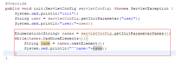 5.我们通过getInitParameterNames() 返回一个Enumeration<String>通过循环而输出各个参数名