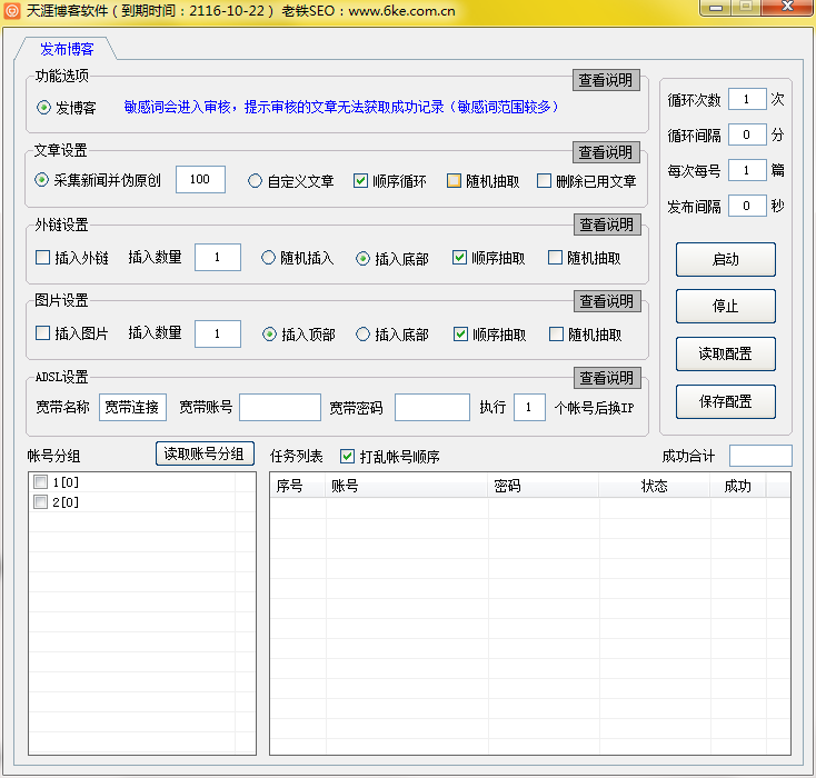 1 . 功能介绍:免验证码,自动发博客,自带新闻采集,可导入自定义txt文章,ADSL拨号换IP