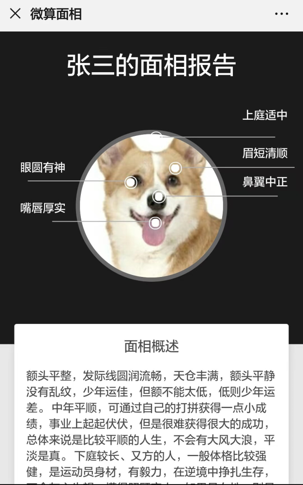 南都记者在“微算面相”中上传了一张宠物狗的照片,竟然也得到了一份报告,五官评分81分,面相概述为“中年平顺、有毅力、非常负责、身体健康”等。