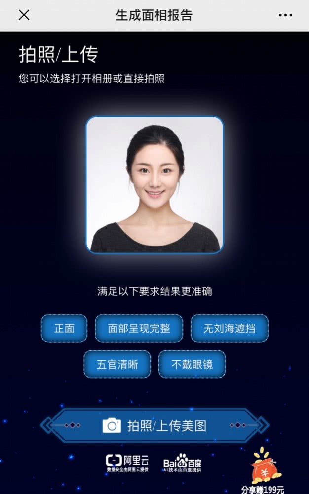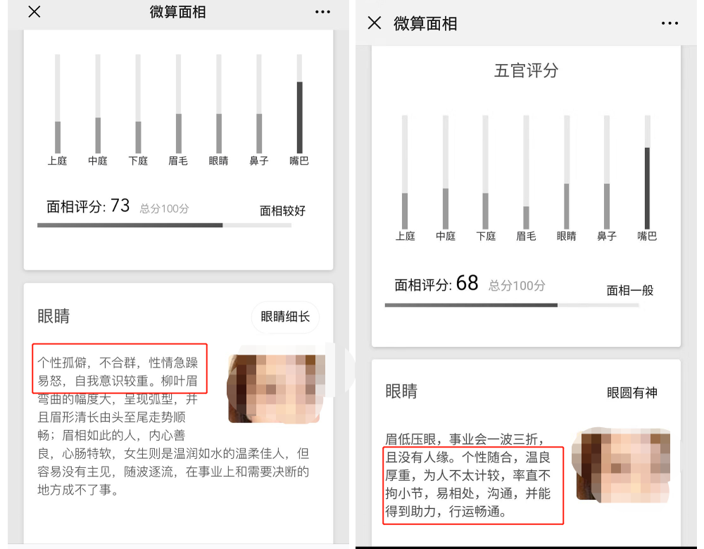 南都记者按照要求在“微算面相”中上传了一张人脸正面照,随后页面显示进入了人脸扫描环节,测量三庭长度、定位五官、综合分析等,几秒后便生成一份面相报告。报告显示了五官评分,并附有面相概述、五官各项分析等内容。不过,从整体来看,报告的描述十分笼统。而且,报告仅显示部分,剩余项目需要付费解锁。