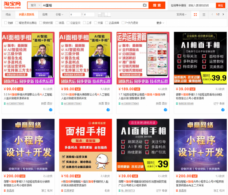 南都记者注意到,在网购平台上,还有不少提供“AI面相手相程序源码开发”服务的商家,价格从99元到几百元不等。买家提供“服务器、域名、认证公众服务号”,购买商家的“源码+授权”,就可以进行自主运营。也有价值500元的“一条龙”服务。客服介绍称,“相面系统,正版的一套4800多元,我这里100多就足够了。” 问及为何开发的不是小程序,而是H5页面时,对方回复称,“小程序审核不过,H5不用审核。”