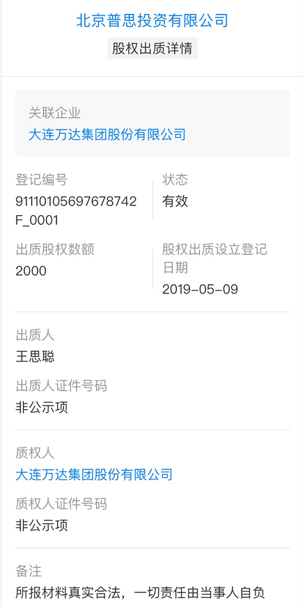 据记者向相关人士了解,2019年5月份,王思聪普思投资的100%股权已质给大连万达集团。