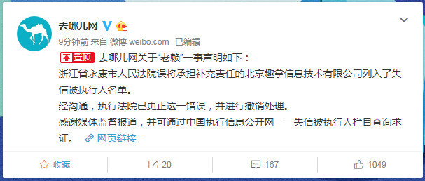 浙江省永康市人民法院误将承担补充责任的北京趣拿信息技术有限公司列入了失信被执行人名单。
