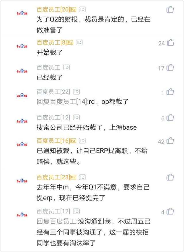 而对于"裁员"的疑问,则有部分百度员工在脉脉上回复称:已经开始裁员了。也有部分百度员工透露了更为详细的消息,如:搜索公司已经开始了;身边的同事已经被沟通了;RD、OP都裁了;这一届的校招同学也要有淘汰率了……