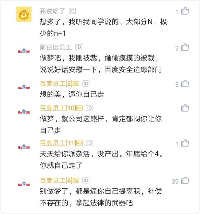 此外,针对裁员后的经济赔偿,也有脉脉用户透露:大部分是N,极少的N+1。但很多百度员工似乎对此并不抱希望,在他们看来,公司应该会通过各种方法来规避支付裁员赔偿,如好言相劝,让员工自己提离职;或利用各种操作,逼迫员工自己离职,如天天派杂活,使员工无产出,最后在年底评定时给个4,这样的话,员工自己就走了……