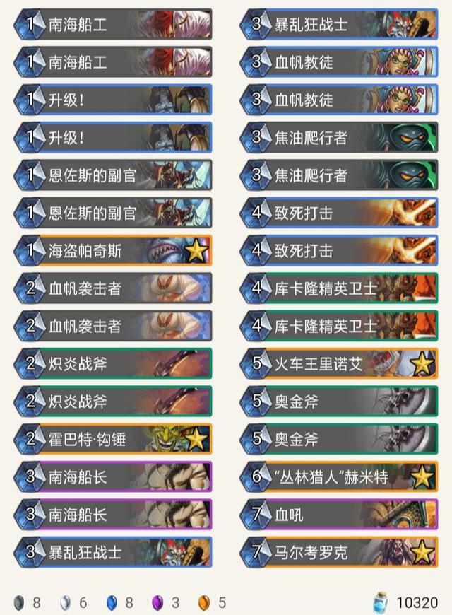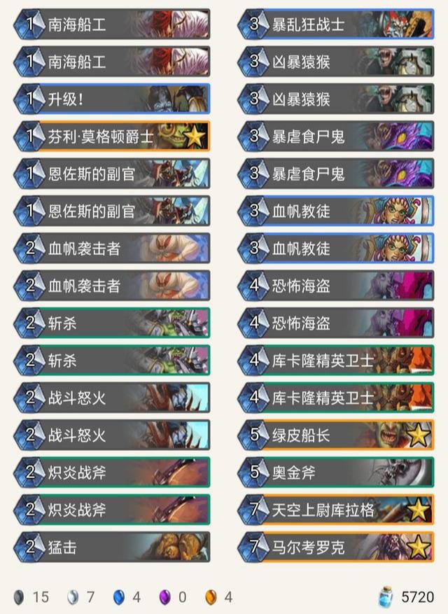 我们可以从卡组构成中看到,当时的海盗战算不上快攻,更像是一套娱乐卡组,原本的名字叫做海盗武器战,甚至还会带上334嘲讽,以及战斗怒火过牌。强度不高,速度也很慢,经常是别人克苏恩都骑脸了还没达到斩杀线。老白芨在那个版本的末期听朋友谈起这套战士,我体验过几局强度很一般,于是我就把绿皮给分解了。塞翁失马焉知非福啊,朋友和我不同,他并没有分解,没过多久就迎来了新版本加基森,海盗战肆虐天梯,朋友的选择是正确的。