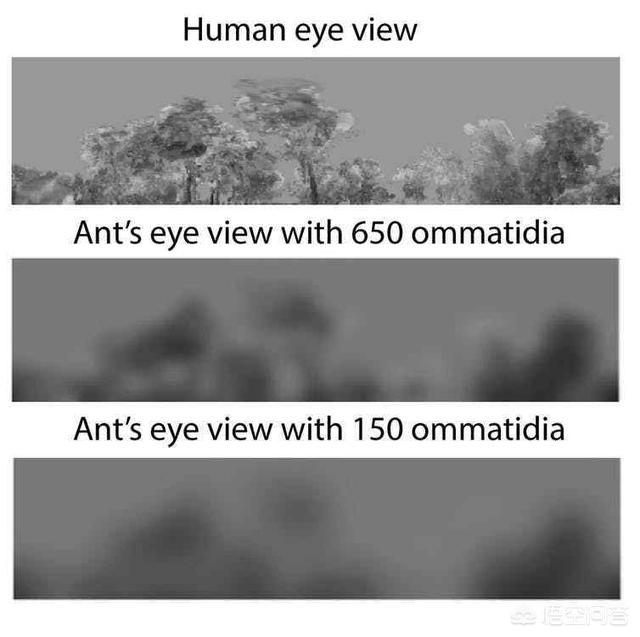 一些科学家通过特殊方式把蚂蚁的眼睛复制下来,得到一个蚂蚁“视网膜”模板,并在适当位置进行拍照,并与人类的视野进行比较,得到图像大概如下,蚂蚁的视野几乎是模糊的。同时也对蚂蚁进行障碍物分辨实验,发现大的蚂蚁在距障碍物17厘米的地方就可分辨出来,而小的蚂蚁要到5厘米才能分辨出障碍物。也就是说蚂蚁根本没法160厘米外人类的头部。