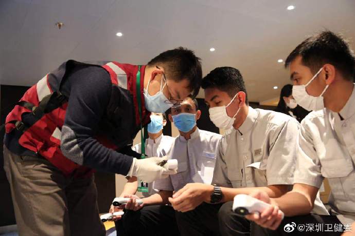 在市委、市政府指挥下,南山区委区政府、市卫健委、市文体旅游局、市交通运输局、海关、边检、蛇口邮轮母港、邮轮公司等第一时间成立应急处置工作组,启动应急预案。鉴于船上人员多、空间密闭等情况,决定该邮轮乘客不下船,由专业人员登船进行排查检测。