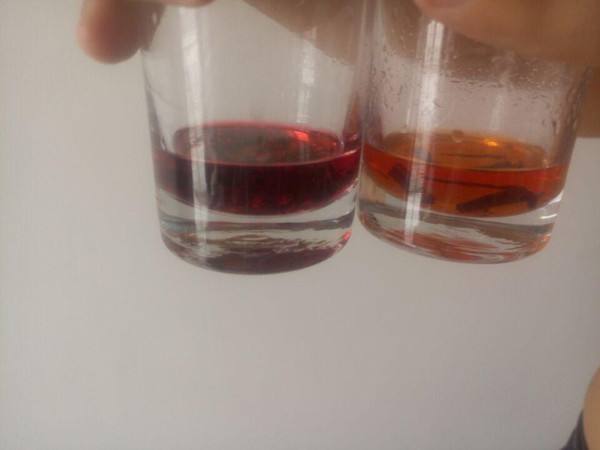 由于紫檀中含有大量深红色的紫檀素,所以将紫檀的木块或者木屑放入白酒中时会有大量深红色的紫檀素溢出,紫檀表面与液体之间形成较粘的胶状物倾倒时能连成线,这个实验主要是验证紫檀素的存在,但并不能说明就是紫檀。