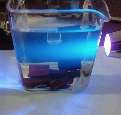 为了更准确地鉴别紫檀,我们还可以取木屑放入盛有清水的玻璃杯中,浸泡十二小时以上,水的最上层(视觉效果:水的最上层和玻璃杯壁附近最明显)若出现蓝色机油般荧光现象,则为紫檀,时间越久则越明显。此步可以用于排除卢氏黑黄檀(大叶紫檀)等其他酸枝木和非紫檀属木材。