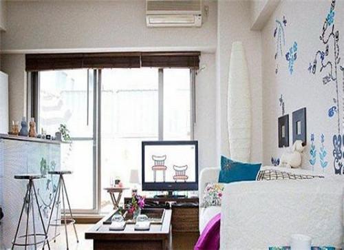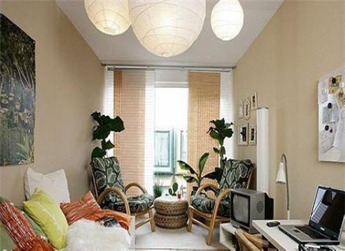 这个客厅空间比较狭小,于是将阳台打通,将阳台和客厅连在一起,显得空间更宽敞。靠窗处摆放2张舒适躺椅,而中间摆放的茶几非常有创意,藤制坐垫改造而成,既可以当坐垫又可以当茶几。客厅中又摆放几盆绿色植物进行装饰,既给空间增添色彩,又美化环境。
