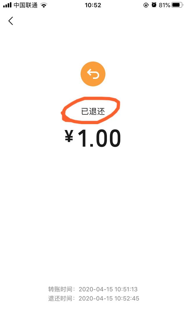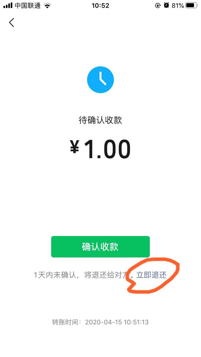 2.在确认收款下方有个提示:1天内未确认,将退还给对方。立即退还