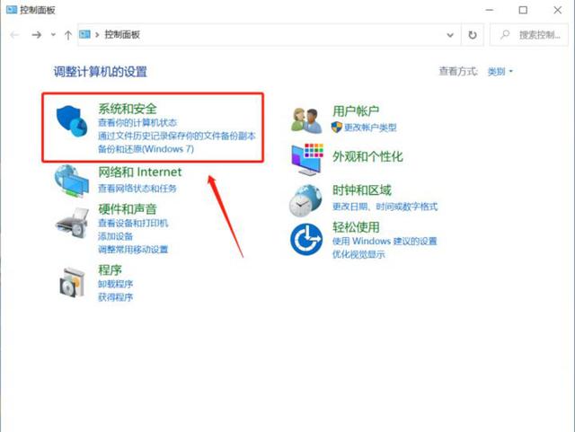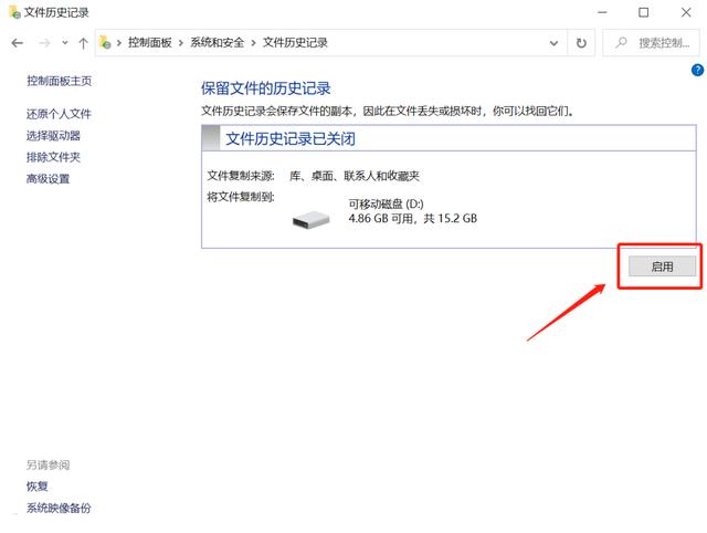 步骤二:在控制面板中找到“系统和安全-历史文件记录”,依次点开;