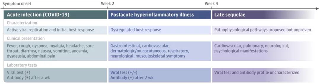 尽管对新冠病毒大流行的许多反应都集中在新冠肺炎疾病本身上,但越来越多的证据表明,除了急性期外,至少还有2个时期在时间上似乎与病毒感染有关:罕见的急性后高炎症性疾病(postacute hyperinflammatory illness)以及晚期炎症和病毒后遗症(late inflammatory and virological sequelae. )。这三个疾病时期不仅在人群水平上定义了感染的时间过程,而且与宿主-病毒相互作用的不同阶段相吻合。