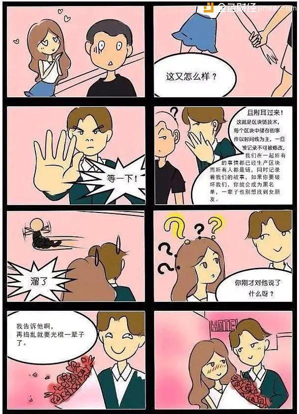 试婚男女谈恋爱,晒朋友圈,秀恩爱,承诺相爱一生一世并被其他所有适婚男女所知就是区块链的应用。如果有一天某一方违背诺言,不要以为删除照片就有用,因为桩桩件件都被所有适婚男女记录在案。