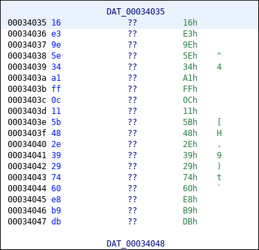 有两个数据块被执行了异或(XOR)操作。 (长度是 0x18)我们可以把断点放在 do while 语句之后,但这不是有效的解决方案。 让我们考虑一种编程方式来查找已解密的字符串。 这些被异或的数据块彼此相邻。 如果我们可以得到数据块的长度,我们可以很容易地得到解密字符串。 然后找到使用这些异或数据块的函数并将函数重命名。 然后,我们可以跳到 2*length,得到下一个被执行异或操作的数据块。 重复这个过程。 开始执行异或操作的数据块是0x34035。 获取该数据块的 xrefs: