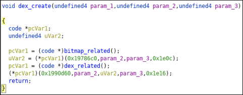 资产文件夹并查找 png 文件。 将此函数重命名为asset_caller。 访问这个函数的 xref,找到0xe2c0。 我重命名了一些函数的名称。 dex_header 在内存中创建 dex 文件。 dex_dropper 把 dex 文件放到系统中,然后加载。