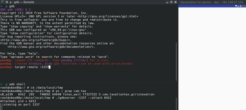 · /data/local/tmp/gdbserver :1337 –attach $pid