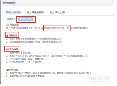 3、查看积分规则,需要仔细看的是加分规则,图示的各项指数大概一定能看懂,所以排除使用黄钻来使空间的情况,要想能快点提升空间等级,就需要提升自己的人气,可以上传一些有意思的照片,发表一些大家愿意看的同时又能抒发情怀的说说,偶尔也可以写写原创日志,同时也可以转载一些有意思的文章,访问量增加的同时,也能通过这个平台维持和朋友的联系,一举多得的事,等级提高也不会成为包袱了。