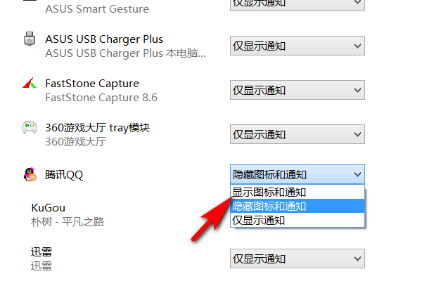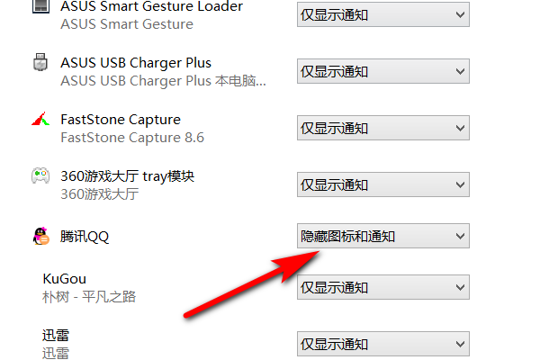 3、进入到自定义窗口界面之后,在里面找到腾讯qq软件,这时候可以看到此选项显示的是隐藏图标和通知。
