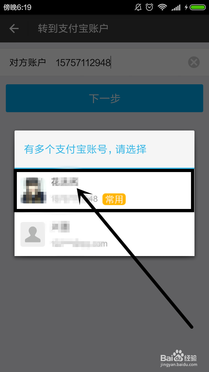 第五步,点击下一步之后,如果出现如上图所示的情况,说明对方有多个支付宝账户,倘若对方没有明确告诉你需要转那个支付宝账户,建议支付宝转账时选择第一个支付宝账户,选择要转账的支付宝账户,点击支付宝账户打开。