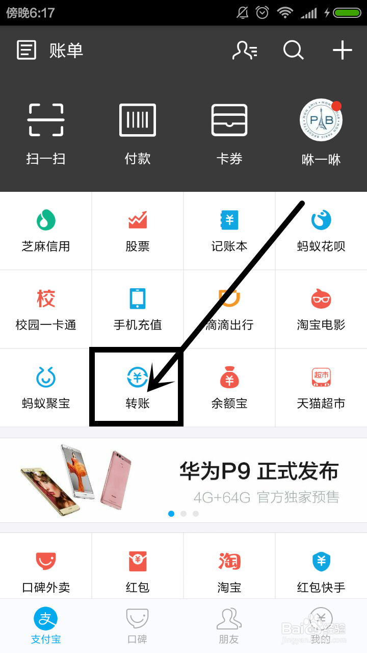 第二步,点击打开支付宝之后,如上图箭头所示,在支付宝主界面第三横行第二竖行,可以看到转账这一按钮,点击转账两字,打开支付宝转账界面。