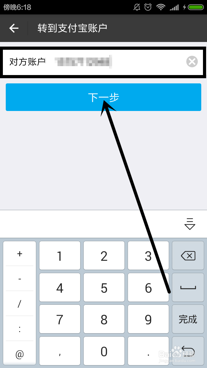 第四步,如上图箭头所示。支付宝账户可以是手机号码,也可以是注册邮箱,两选其一便可。在对方账户输入要转账的支付宝账户,点击下一步,进行下一步操作。