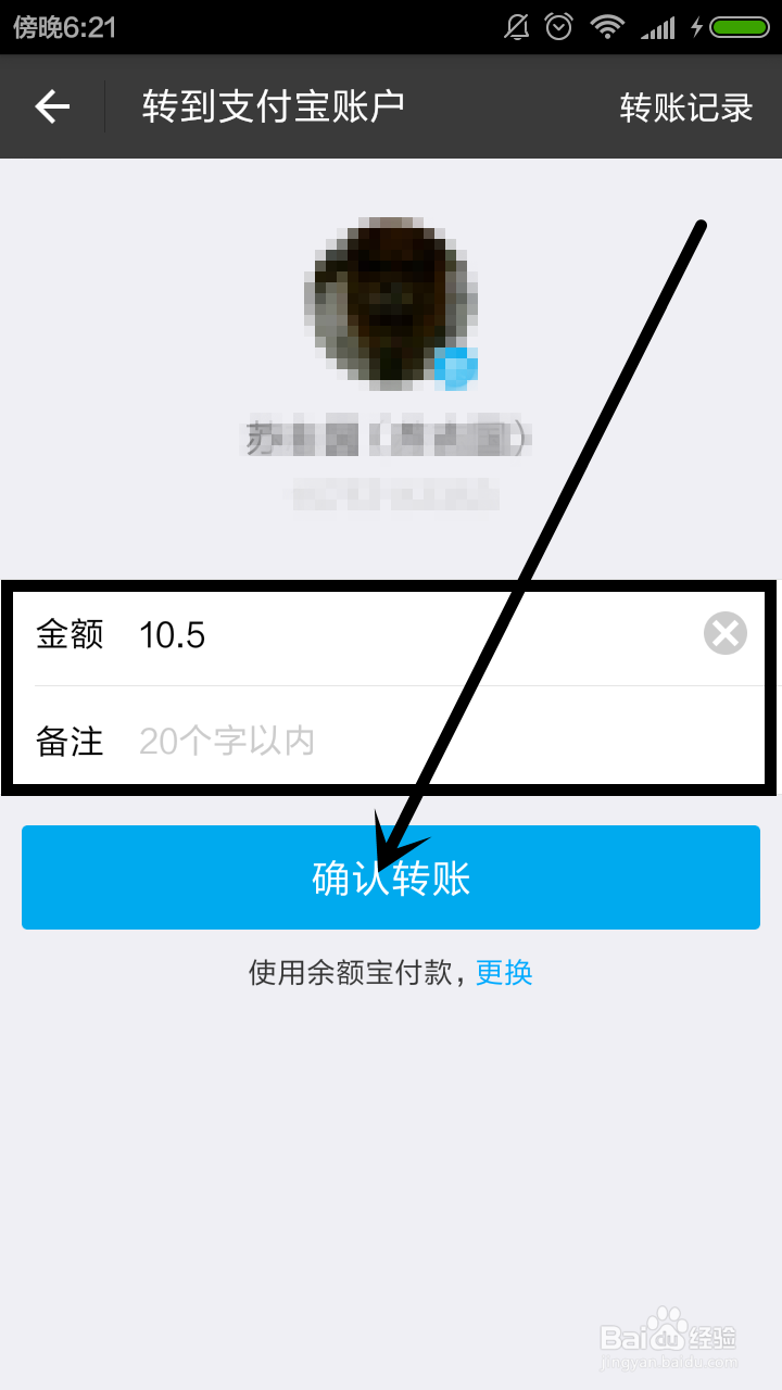 第六步,如上图所示。在金额一栏,输入要给支付宝账户转账的金额,在备注一栏,可以添加一些特别情况说明,如转账理由等,然后点击确认转账。