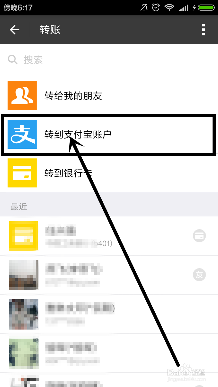 第三步,如上图所示,点击转账之后,支付宝跳转到转账页面。在转账页面,你可以选择转账对象,转给我的朋友,转到支付宝账户,转到银行卡。转给我的朋友和转到支付宝账户,转账操作一模一样,不同之处是转账到支付宝账户,可以给陌生人转账,转给我的朋友,只能给自己的支付宝朋友转账。选择转到支付宝账户,点击打开转到支付宝账户,给支付宝账户转账。